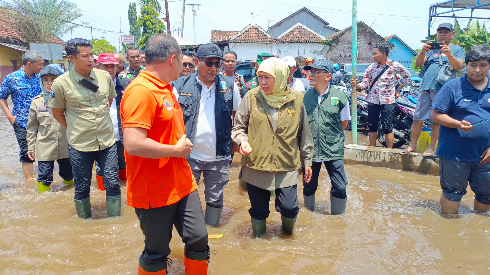 Khofifah Indar parawansa terlihat didampingi Kalaksa BPBD Jatim Gatot Subroto, Wakil Bupati Pasuruan Shobih Asrori dan beberapa kepala dinas mendatangi lokasi banjir dengan memberikan bantuan.