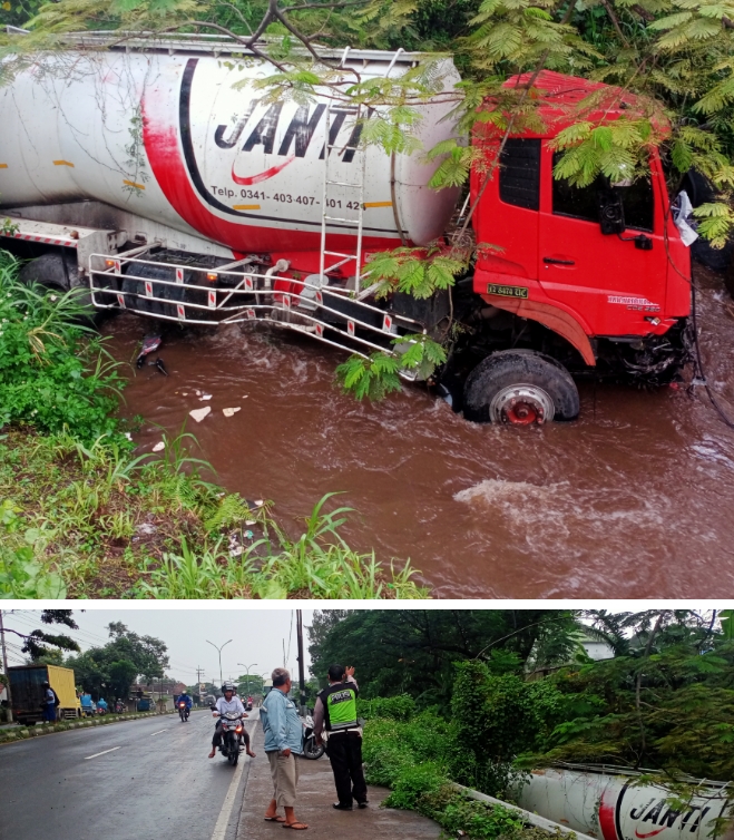 Di tengah kontur jalanan aspal yang menurun dengan kondisi jalanan basah akibat hujan, sesampainya di TKP mobil Truk Tangki tersebut seperti banting setir ke arah kiri menabrak guadrail hingga jebol dan kemudian terjun ke sungai.
